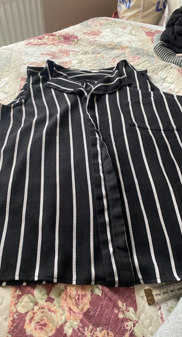 Düğmeli ve V yakalı, kolsuz kadın gömleği. Siyah zemin üzerine beyaz dikey çizgilerle, bol kesim ve sentetik kumaştan üretilmiştir.