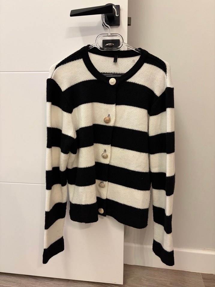 Bu kadın hırka, düğmeli ve yuvarlak yakalıdır. Siyah-beyaz kalın çizgilerle yün kumaştan yapılmıştır, rahat ve günlük kullanım için uygundur. Hediye geldi kullanmıyorum