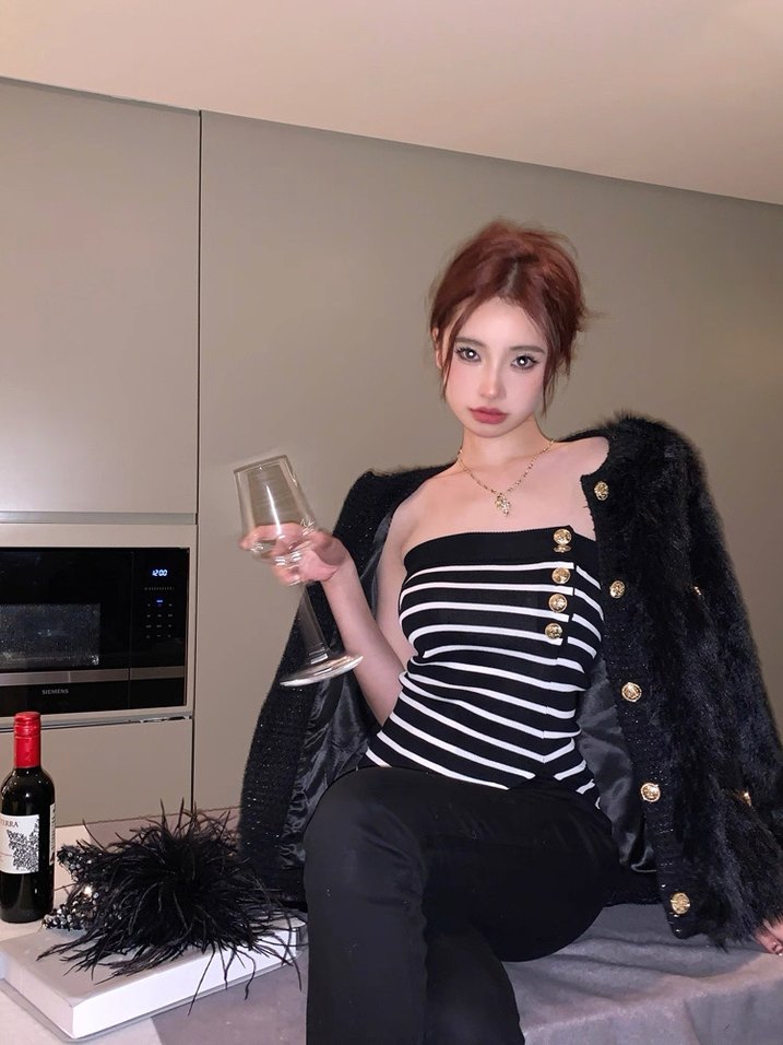 Düğmeli Siyah Beyaz Çizgili Straplez bluz