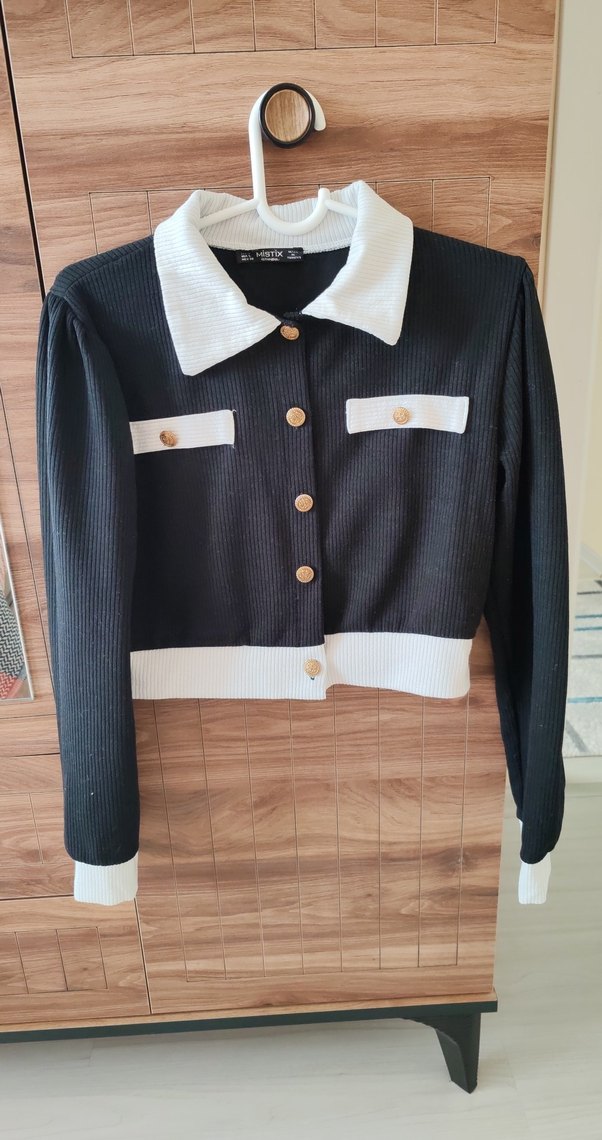 Düğmeli, uzun kollu, siyah beyaz kadın crop Kısa, regular fit ve sokak tarzında, yapay kumaştan üretilmiştir. L beden ama kalıbı dar.