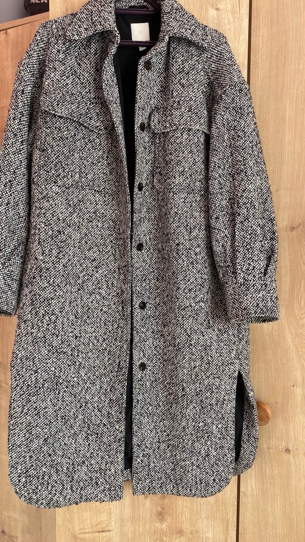 Uzun kollu, düğmeli ve yanları yırtmaçlı siyah beyaz desenli kaban. Dokulu kumaş ve rahat kesime sahip.