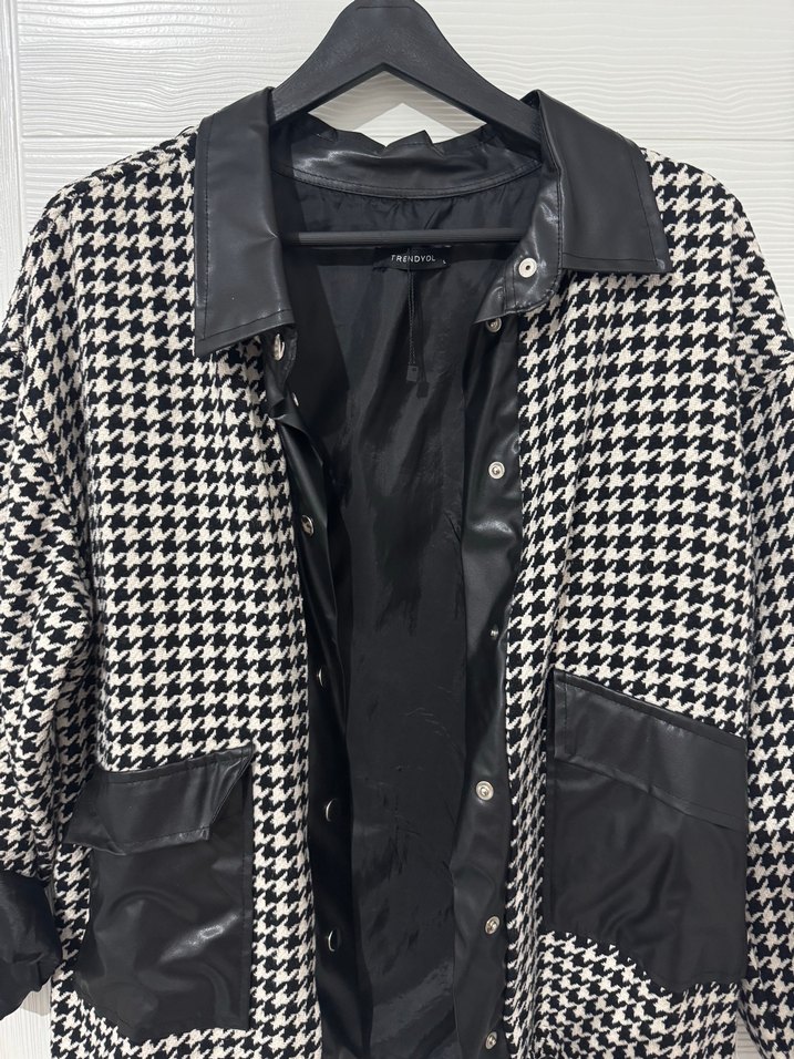 Düğmeli, uzun kollu, siyah beyaz desenli kadın ceket göründüğü gibidir şık bir parçadır. M-L bedene uyumludur.