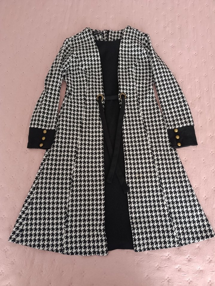 Düğmeli manşetler ve kesikli yakaya sahip siyah beyaz desenli uzun kaban, günlük kullanım için klasik ve şık bir uyum sunar. tunik şeklindedir