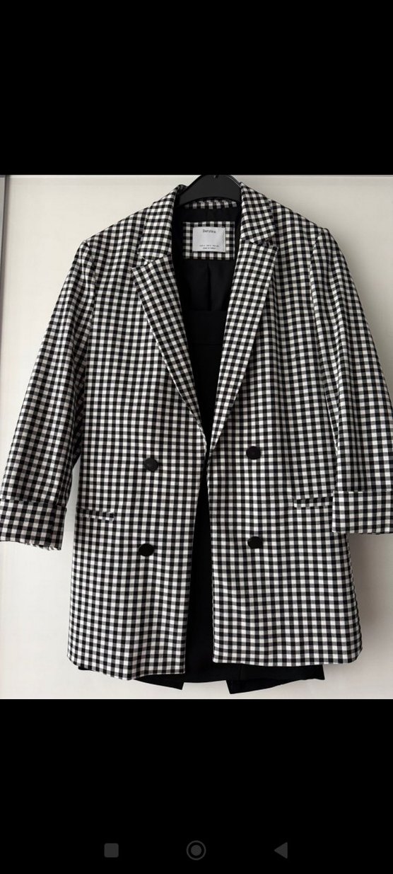 Düğmeli, siyah beyaz ekose desenli, normal boy midi uzunlukta, regular fit ve çıtçıtlı kolları olan kadın blazer. Ofis için uygun.