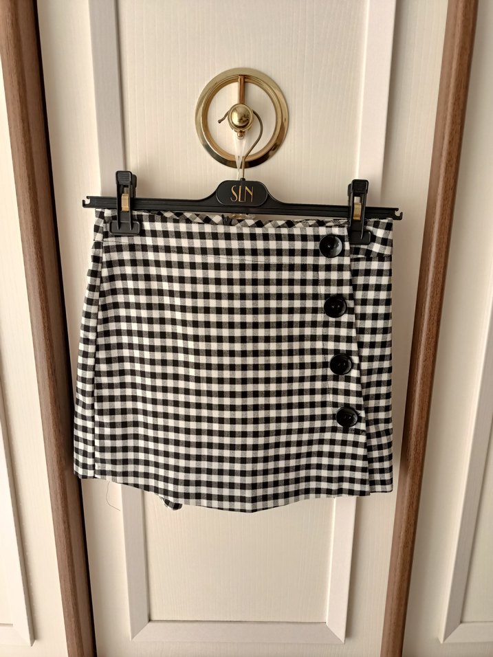 Düğmeli, siyah beyaz ekose desenli, sentetik kumaştan yapılmış dar kesim mini şort etek Günlük kullanım için uygun