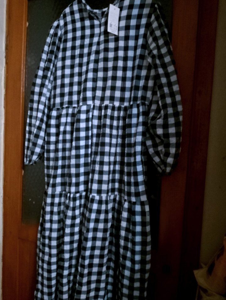 Siyah beyaz ekoseli, düğmeli, uzun kollu ve salaş kesim uzun elbise, sentetik kumaştan üretilmiştir. Günlük rahat kullanıma uygundur.