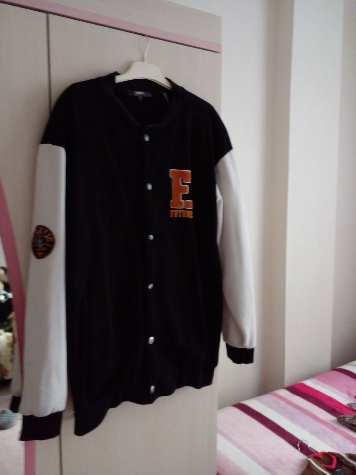 Düğmeli, uzun kollu, bol kesim siyah beyaz erkek ceket. Baskılı detaylı, günlük kullanıma uygun, bisiklet yaka tasarımlı.