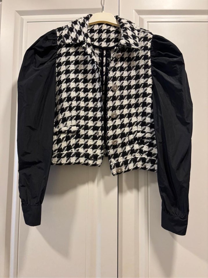 siyah beyaz kazayağı desenli, kolları siyah uzun kollu, düğmeli, yaka kısmı kesik