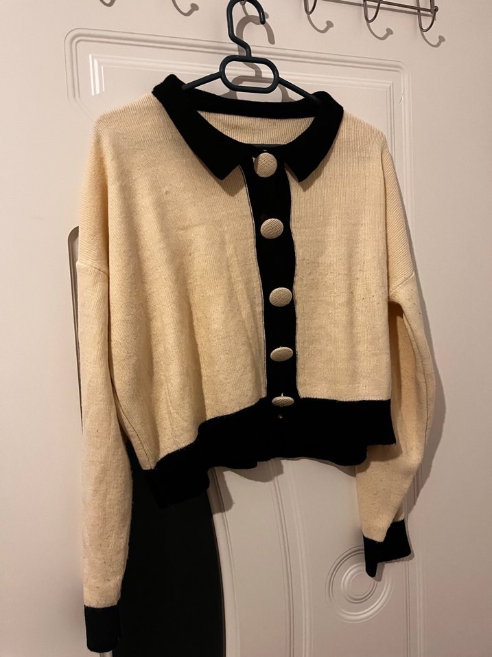 Beyaz yün hırka, siyah kenar detayları ve büyük düğmelerle dikkat çekiyor. Uzun kollu, bol kesim ve midi boydur. Normcore ve Paris tarzı günlük kullanım için uygundur.
