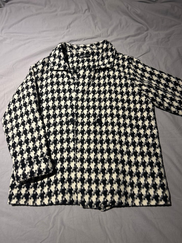 Düğmeli, uzun kollu ve kruvaze yakalı bu kadın ceketi yumuşak yün kumaştan yapılmıştır. Siyah beyaz deseni ve bol kesimiyle midi boydadır. Hiç giyilmedi. Dolapta durduğu için satıyorum.