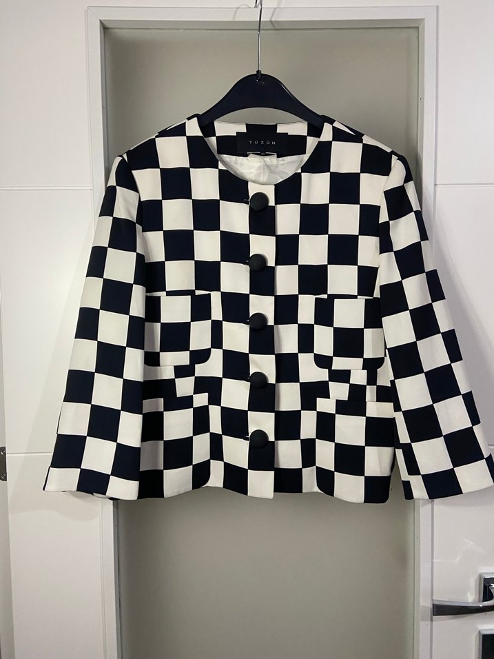 Düğmeli, uzun kollu, tekne yaka kadın blazer. Normal kesim ve midi boyda, siyah beyaz kareli dokuma kumaştan, ofis kullanımı için uygundur. Yepyeni durumda