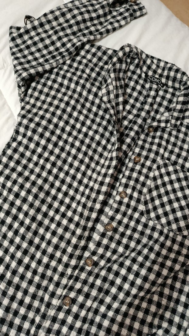 Düğmeli, uzun kollu, siyah beyaz kareli kadın gömlek. Gevşek kesim, normal midi boyda ve yumuşak dokulu kumaştan üretilmiştir. Rahat günlük kullanım için uygundur.