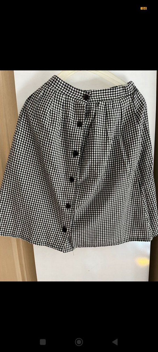 Pamuk kumaştan, siyah beyaz kareli desenli, düğmeli ve bol kesim midi etek. Günlük sokak stili için uygundur.