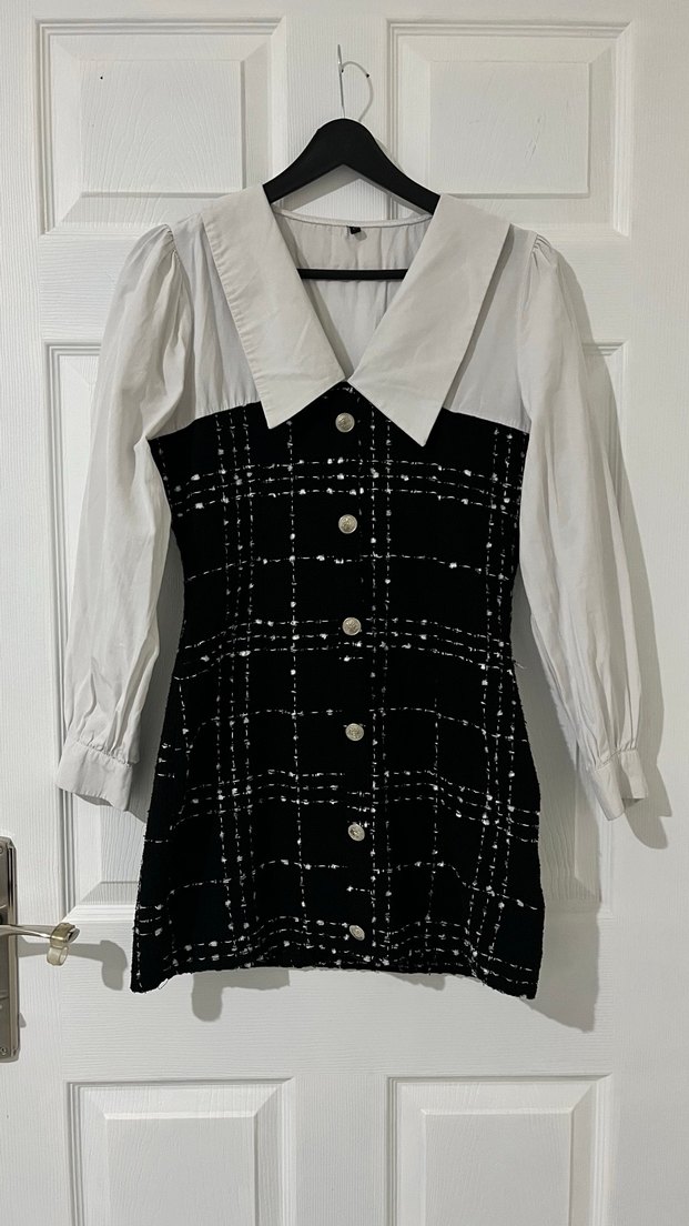 Düğmeli önde, yakalı ve uzun kollu mini elbise. Siyah beyaz kareli desene sahip, regular fit, Paris tarzında ofis için uygun şık bir model.