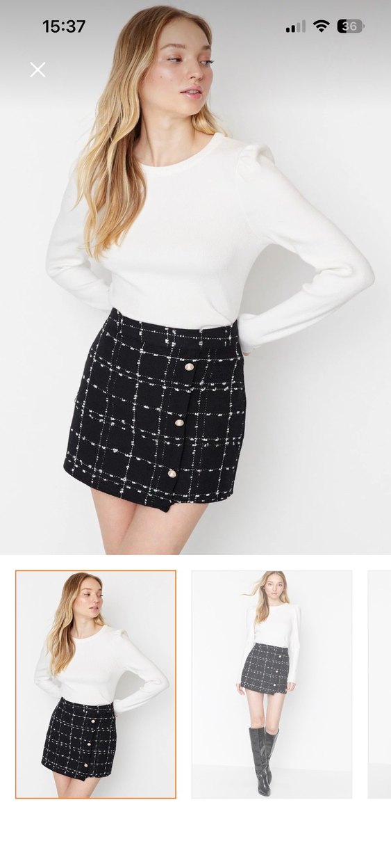 Pamuk kumaştan, düğmeli, siyah beyaz kareli desenli, modern kesim mini etek. Günlük kullanıma uygundur. Kaşe