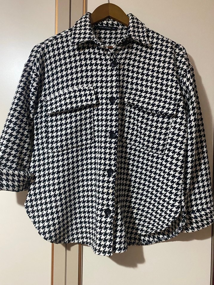 Düğmeli, kazayağı desenli siyah beyaz kadın gömlek. Uzun kollu, notched lapel yaka ve normal midi boyda, sentetik kumaştan yapılmıştır. Rahat ve trend bir görünüm sunar. M/L bedene uyar