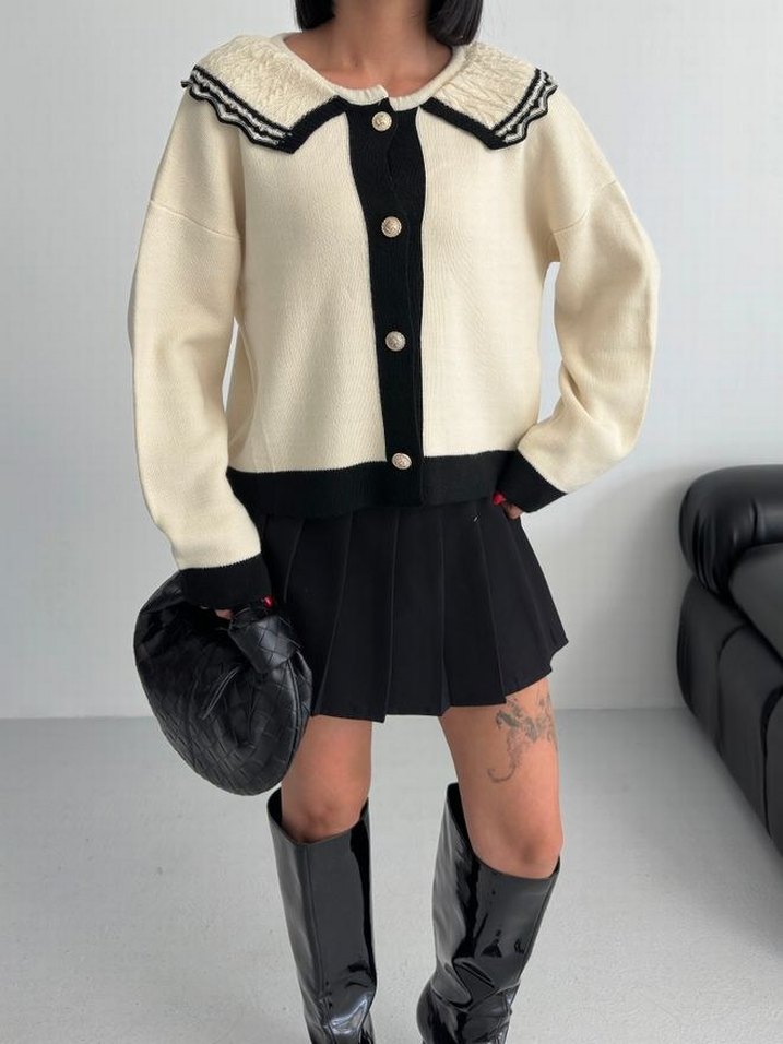 Düğmeli, uzun kollu, notalı yakalı siyah-beyaz renklerde, bol kesim kısa örgü kadın hırkası.
