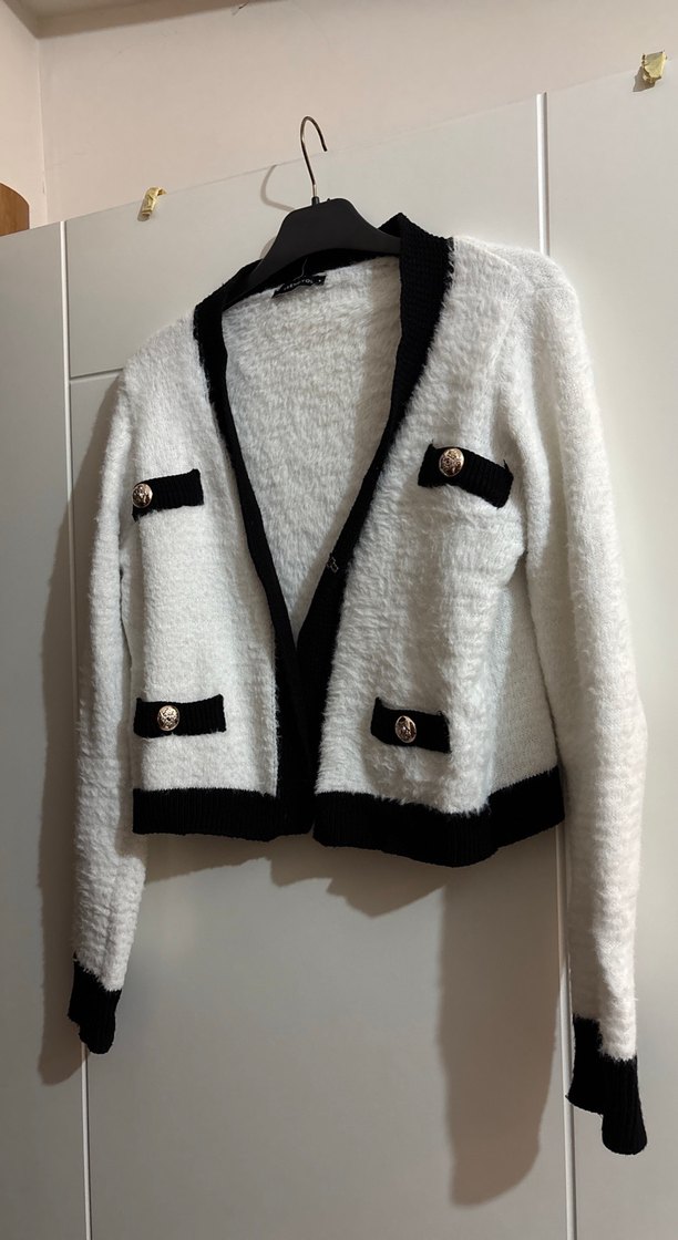 Düğmeli, uzun kollu, notched lapel yakalı, siyah-beyaz renklerde, midi uzunlukta, yumuşak ve sıcak dokulu kadın hırkası. Günlük kullanıma uygun, fit kesim ve streetwear tarzı.
