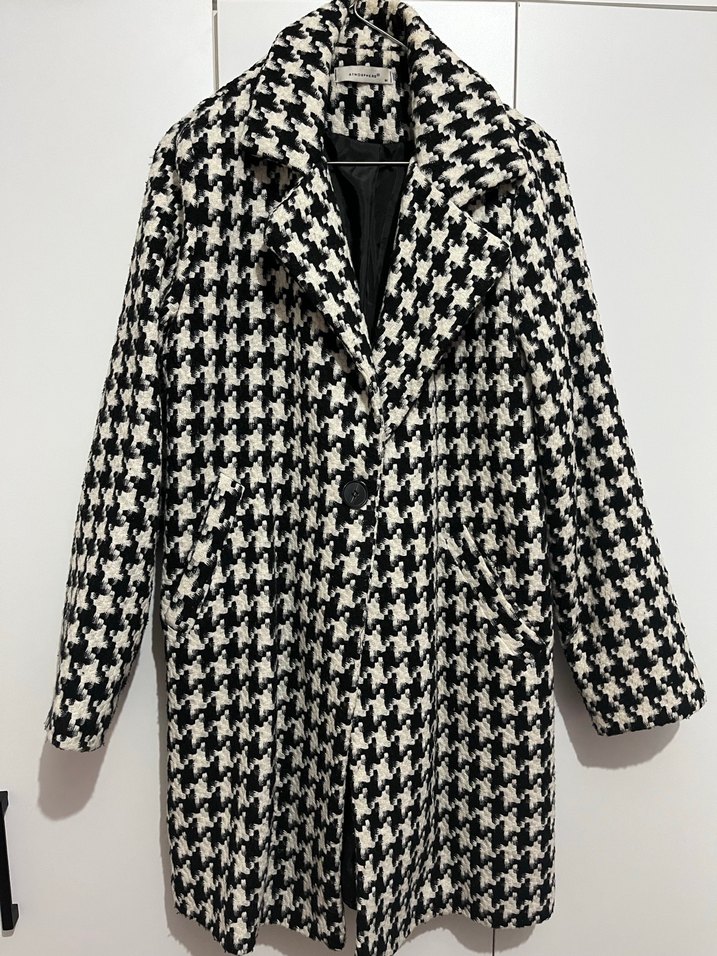 Düğmeli, normal uzunlukta, uzun kollu, klasik yaka detaylı, siyah beyaz kazayağı desenli kadın kaban. Günlük kullanıma uygundur.