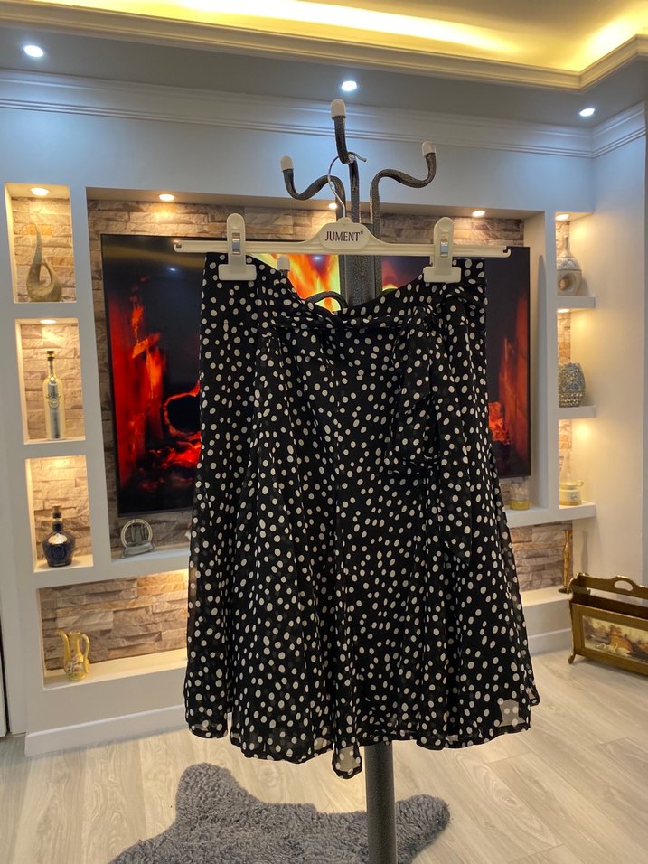 Düğmeli, siyah renkli, beyaz puantiyeli desenli, sentetik kumaştan yapılmış, rahat kesimli mini etek. Günlük kullanım için uygundur.