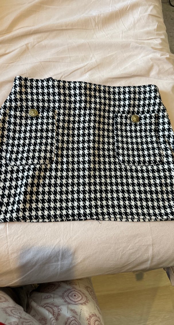 Düğmeli, siyah beyaz kareli desene sahip, sentetik kumaştan yapılmış, vücuda oturan mini etek. Günlük kullanıma uygun, şık Paris tarzı sokak giyimi.