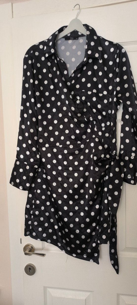Siyah zemin üzerine beyaz puantiyeli, düğmeli midi elbise. Uzun kollu, yakası kesimli, vücuda oturan kesime sahip, günlük sokak stili için uygun. bazı yerlerinde ip atması var belli belirsiz dikkat çekmiyor