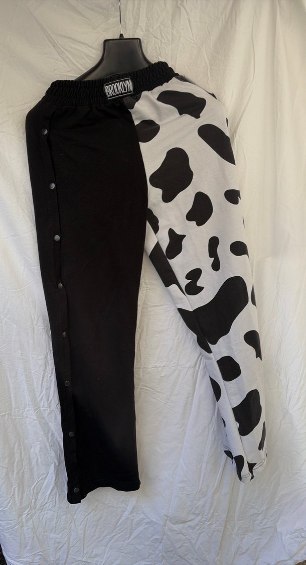 Düğmeli detaylı, siyah beyaz baskılı, sentetik kumaştan rahat kesim kadın pantolon. Günlük kullanıma uygundur.