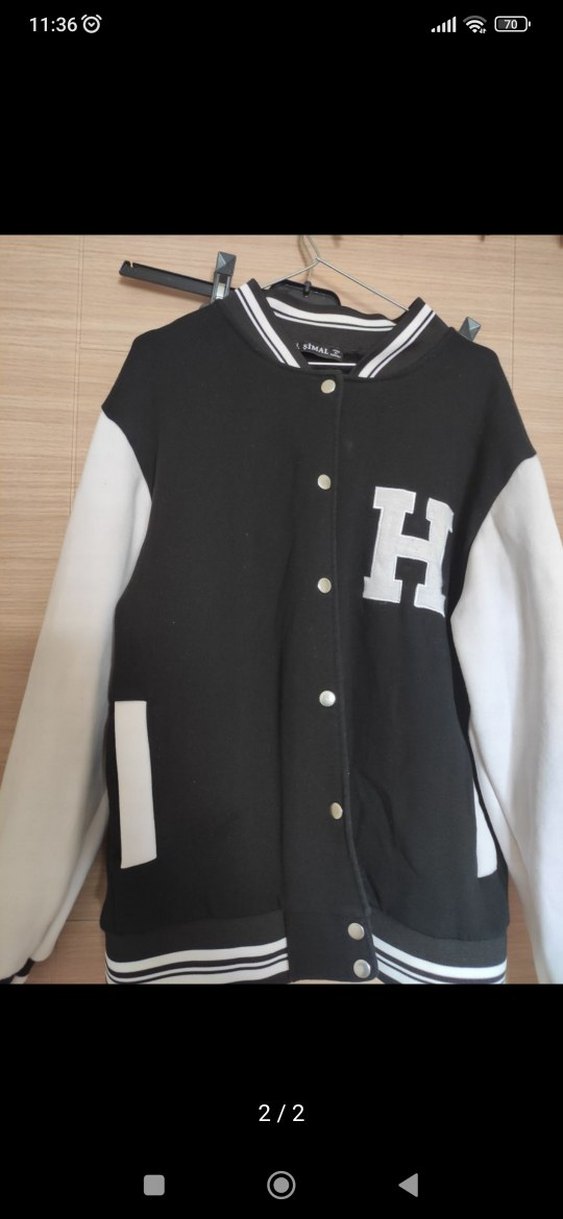 Bol kesim, uzun kollu, düğmeli ve yüksek yakalı siyah beyaz ceket. Önünde 'H' baskısı bulunur. Günlük kullanıma uygundur.
