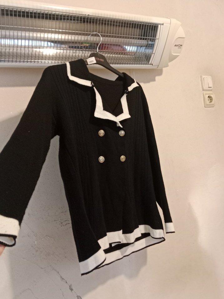 Düğmeli ön kısmı ve beyaz şerit detayları olan siyah triko kazak. Uzun kollu, rahat kesim ve midi boyda, günlük kullanıma uygun.