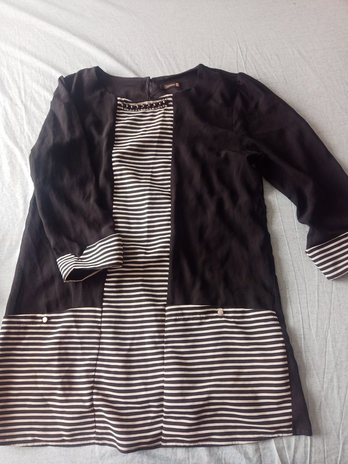 Düğmeli, uzun kollu ve salaş kesim hamile tunik. Siyah ve beyaz çizgili detaylarla sade ve günlük kullanıma uygun.kollari sifon