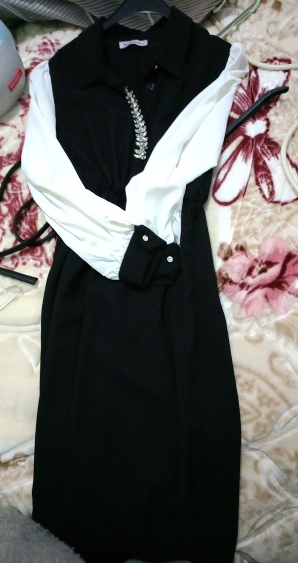 Düğmeli Siyah Beyaz Uzun Kollu Kadın Elbise