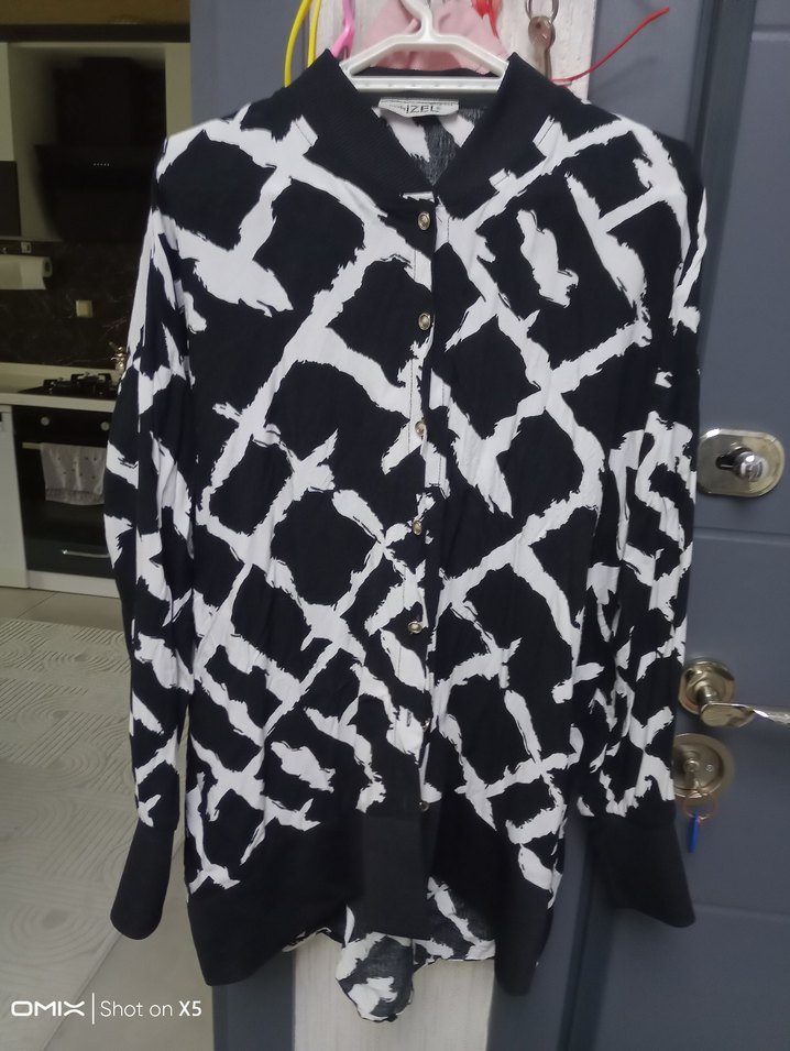 Siyah beyaz batik desenli, düğmeli, uzun kollu, yakalı ve salaş kesim sentetik kumaş gömlek.