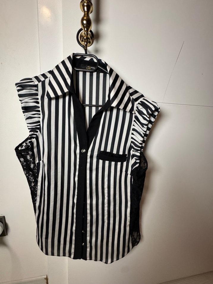 Düğmeli, kolsuz, yakalı ve fitted kesim gömlek. Siyah-beyaz zebra çizgili deseniyle trendy ve şehirli tarzı yansıtıyor. Sentetik kumaştan üretilmiştir.