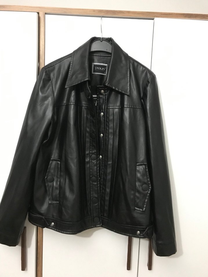 Siyah deri biker ceket, düğmeli ön ve kesik yaka detayına sahiptir. Normal midi boy ve regular kesim ile günlük şık tarz için uygundur.