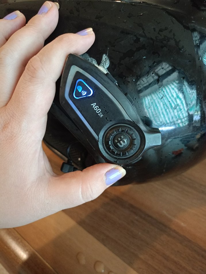 kulaklık üzerinde monte halinde çalışıyor suya dayanıklıdır Bluetooth özelliği ile kullanılıyor.. kaskın vizoru yok görüldüğü gibi. ....Düğmeli iletişim cihazı ve baskılı detaylara sahip siyah plastik biker motosiklet kaskı, rock punk havasında. ️