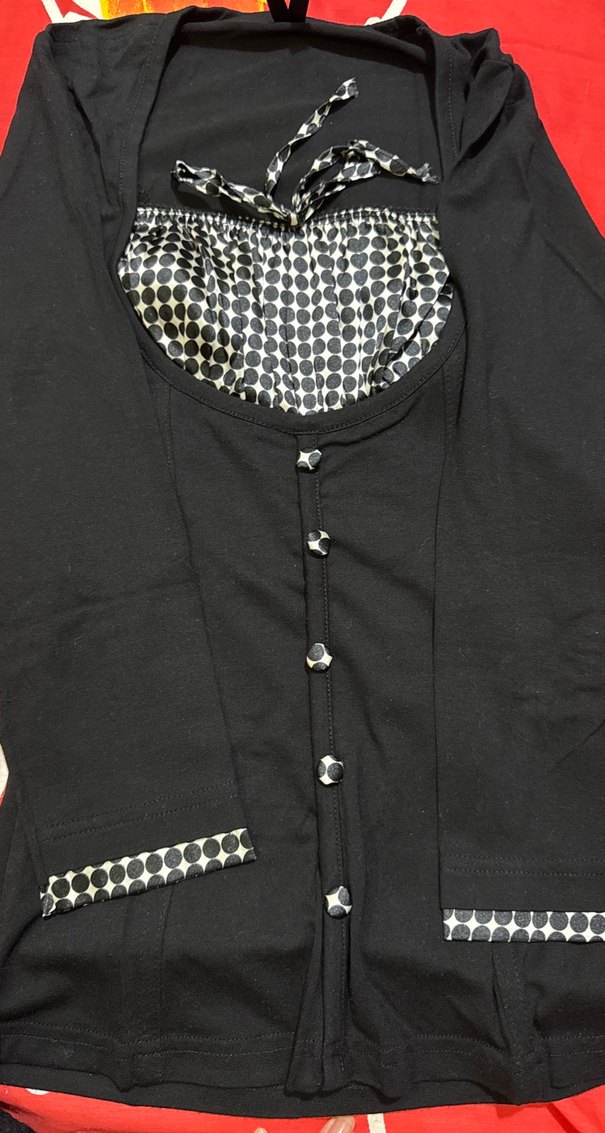 Düğmeli, uzun kollu, yuvarlak yakalı siyah bluz Parlak siyah ve desenli detaylarıyla goth ve Paris tarzını yansıtır. Günlük kullanıma uygundur.