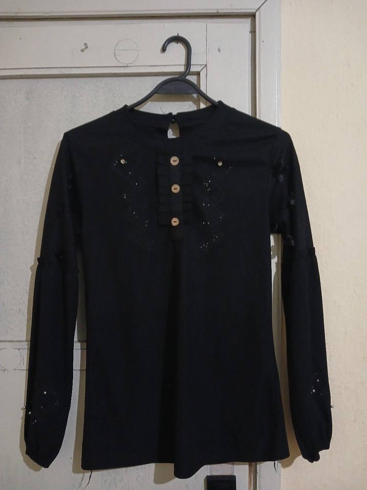 Siyah süet kumaştan yapılmış, düğmeli ve uzun kollu bluz günlük kullanıma uygun.