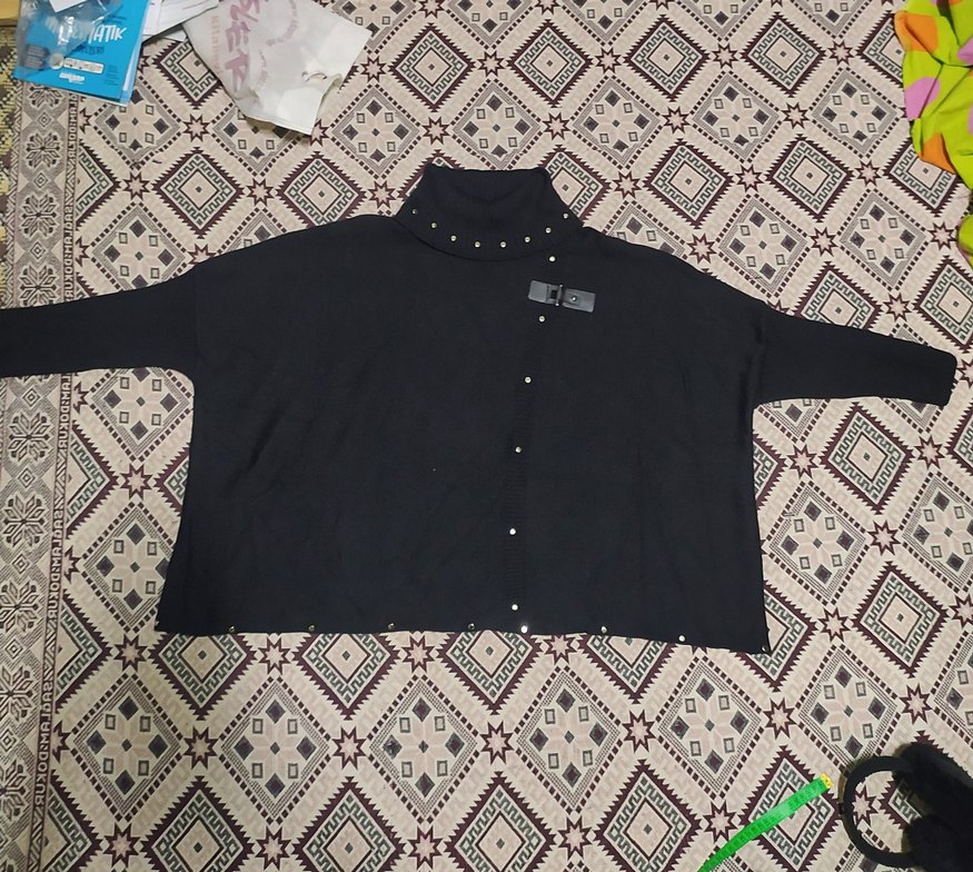 Düğmeli ön kısmı ve boğazlı yakası olan siyah triko. Uzun kollu ve bol kesim, yumuşak ve sıcak kumaştan üretilmiştir. hiçbir sorunu yoktur