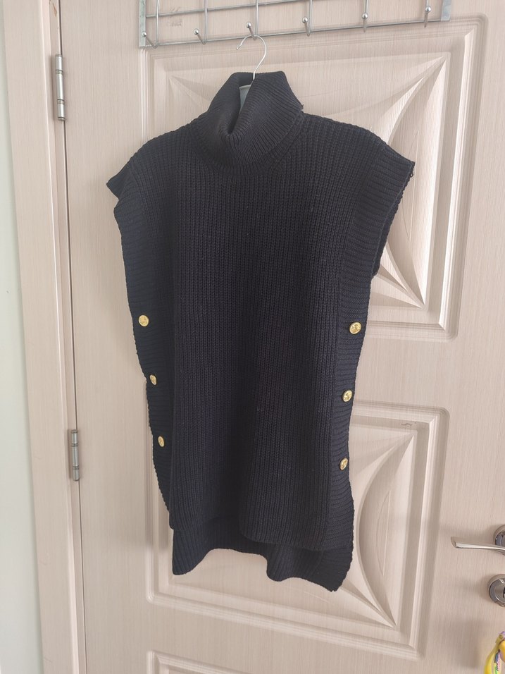 Siyah renkte, boğazlı ve kolsuz triko süveter. Yanlarda düğme detayları bulunur, bol kesim ve midi boydadır. Rahat sokak stili için uygundur.