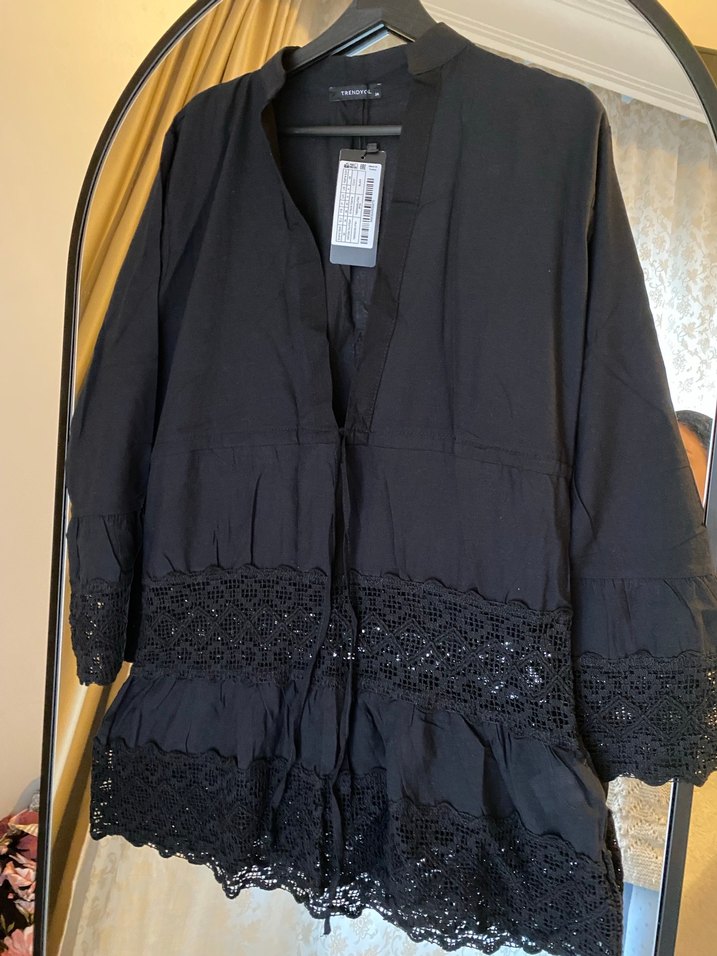 Siyah renkli, düğmeli ve bol kesim hamile bluzu. Uzun kollu, keten kumaştan ve işlemeli detaylara sahip, romantik bir gece için uygundur.