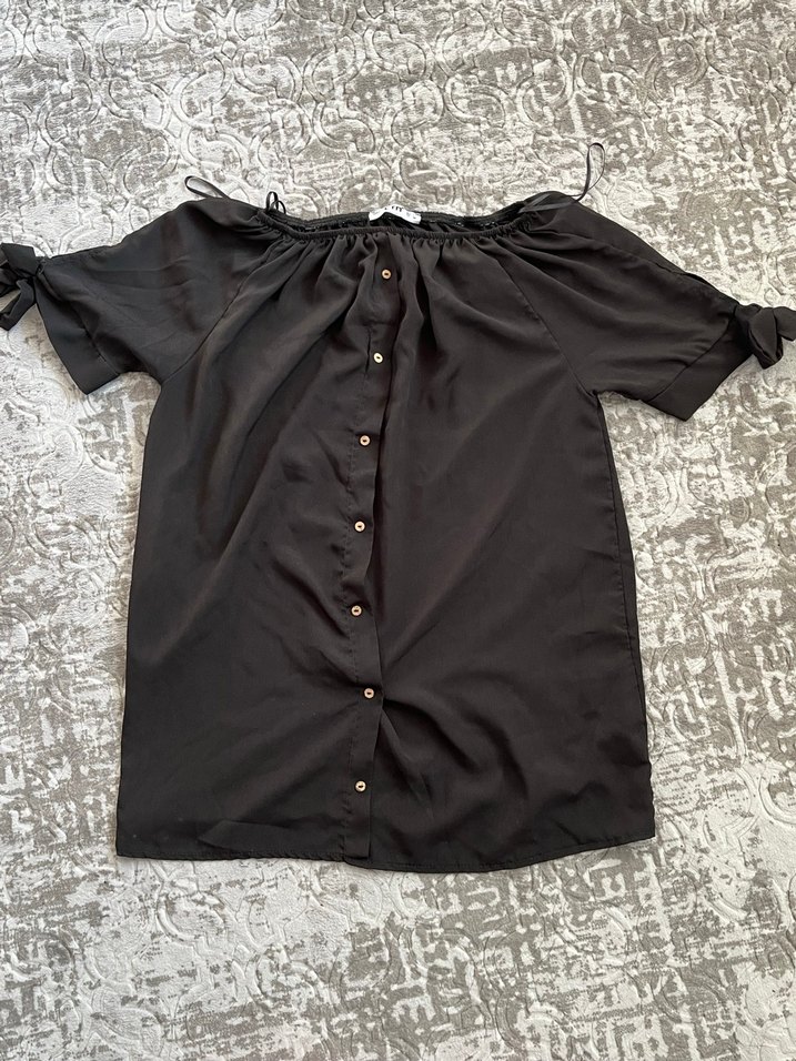 Siyah renkte, kayık yaka ve kısa kollu, düğmeli, bol kesim midi uzunlukta kadın bluz. Yumuşak sentetik kumaştan üretilmiştir, günlük kullanım için uygundur.