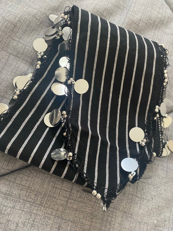 Bu siyah bohem fular, çizgili desene ve düğmelere sahip olup, kenarlarında parlak yuvarlak süslemelerle retro ve avangart tarzına uygundur.