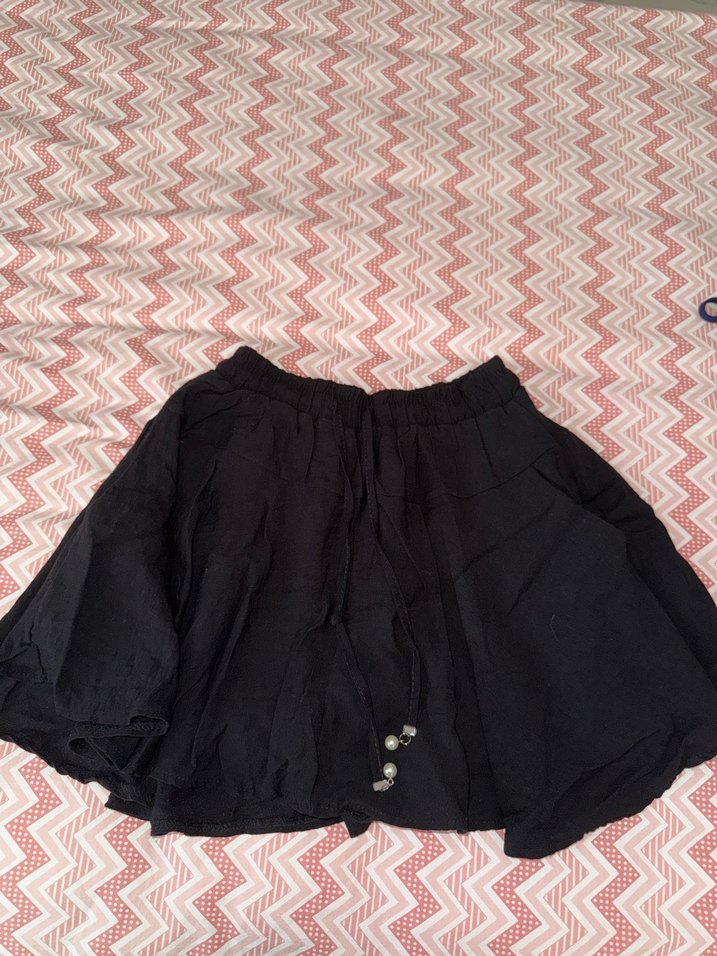 Düğmeli, bol kesim siyah mini etek, yumuşak sentetik kumaştan. Günlük kullanım için bohem tarzda. ✨