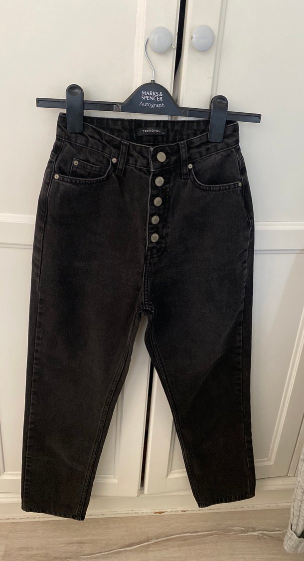 Düğmeli, bol kesim siyah denim pantolon, midi boy ve günlük kullanım için uygun sokak stili. Desensiz ve rahat bir tasarım.