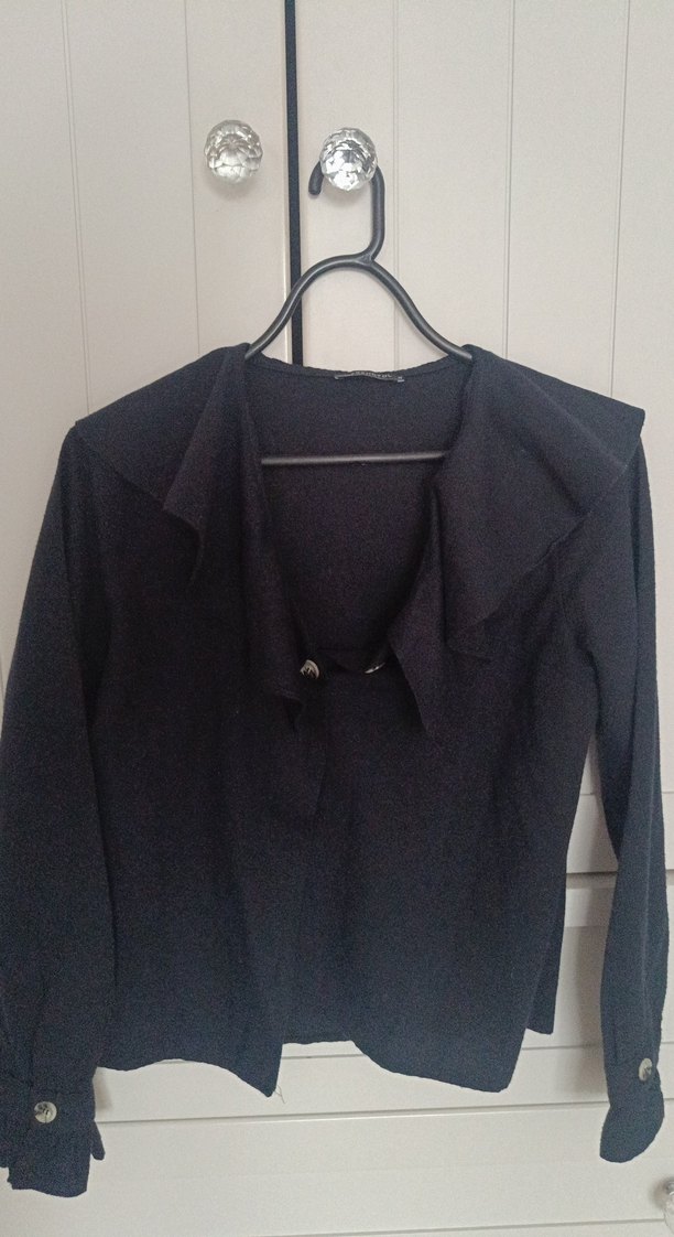 Siyah, düğmeli, yakalı midi uzunlukta hamile ceketi. Uzun kollu, bol kesim ve keten kumaştan yapılmıştır. Ofis için goth tarzda uygun.