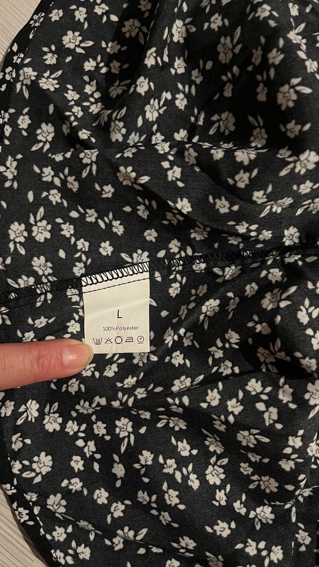 Düğmeli, uzun kollu, V yakalı, siyah zemin üzerine beyaz çiçek desenli, midi boy, hamile bluzu. Rahat sentetik kumaştan üretilmiştir.