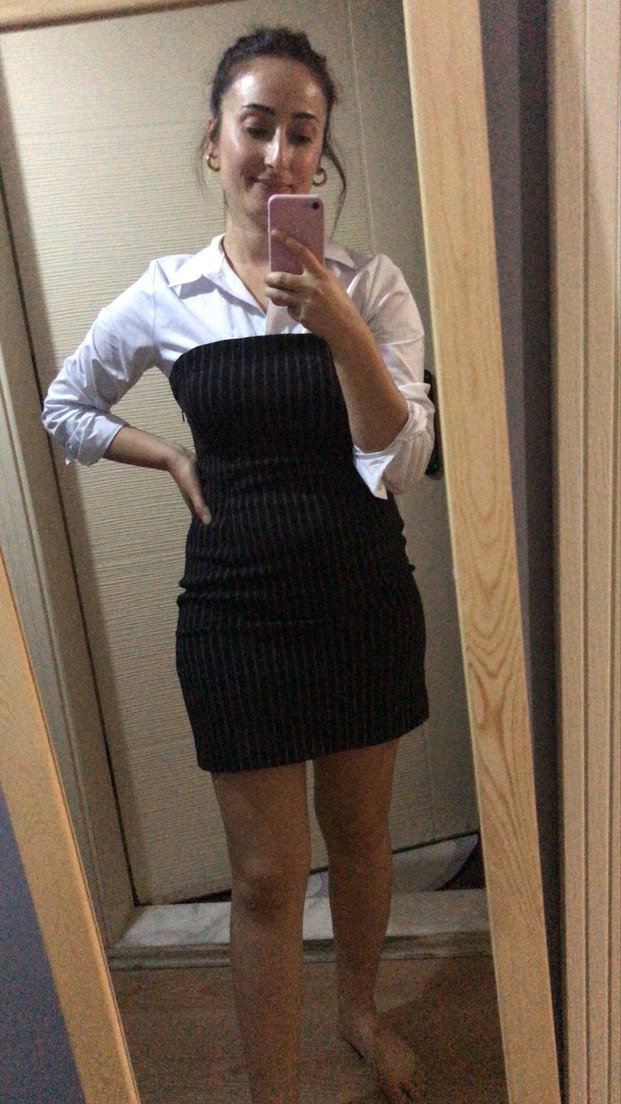 Düğmeli, askılı ve straplez yaka detaylı, siyah çizgili midi boyda, vücuda oturan bir elbisedir. Ofis için uygundur.