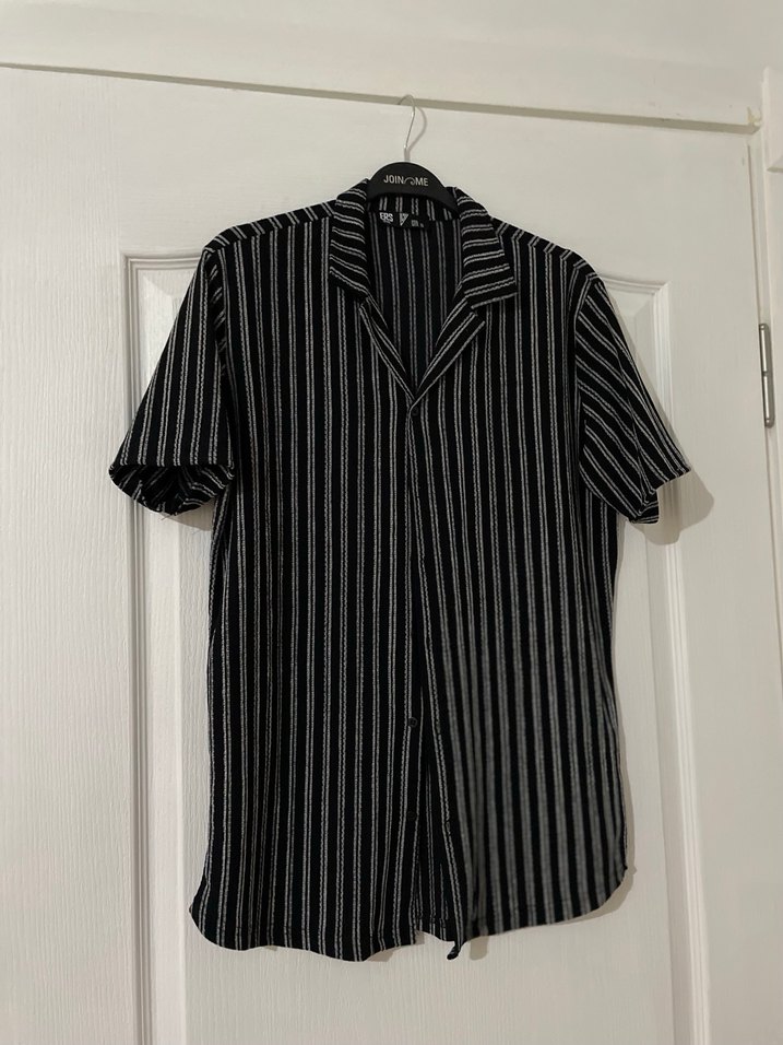Siyah erkek gömlek, kısa kollu, düğmeli ve notalı yaka detayına sahiptir. Çizgili deseni ve regular kesimi ile ofis için uygundur.