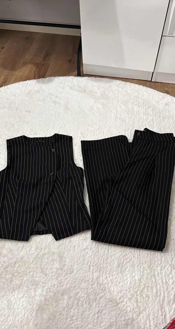 Düğmeli, yakalı, çizgili siyah kadın takımı, kolsuz yelek ve midi boy pantolondan oluşur. İş ortamları için uygundur.