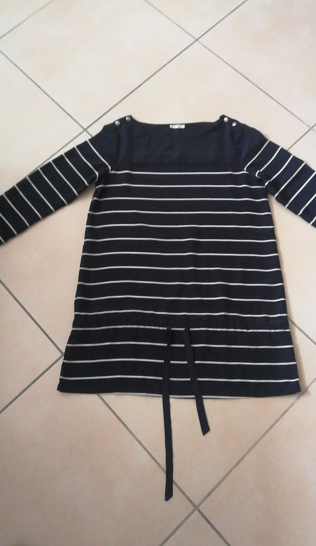 Siyah ve beyaz çizgili hamile triko, kayık yaka ve uzun kolludur. Omuzlarında düğme detayı bulunur, rahat sentetik kumaştan yapılmıştır.